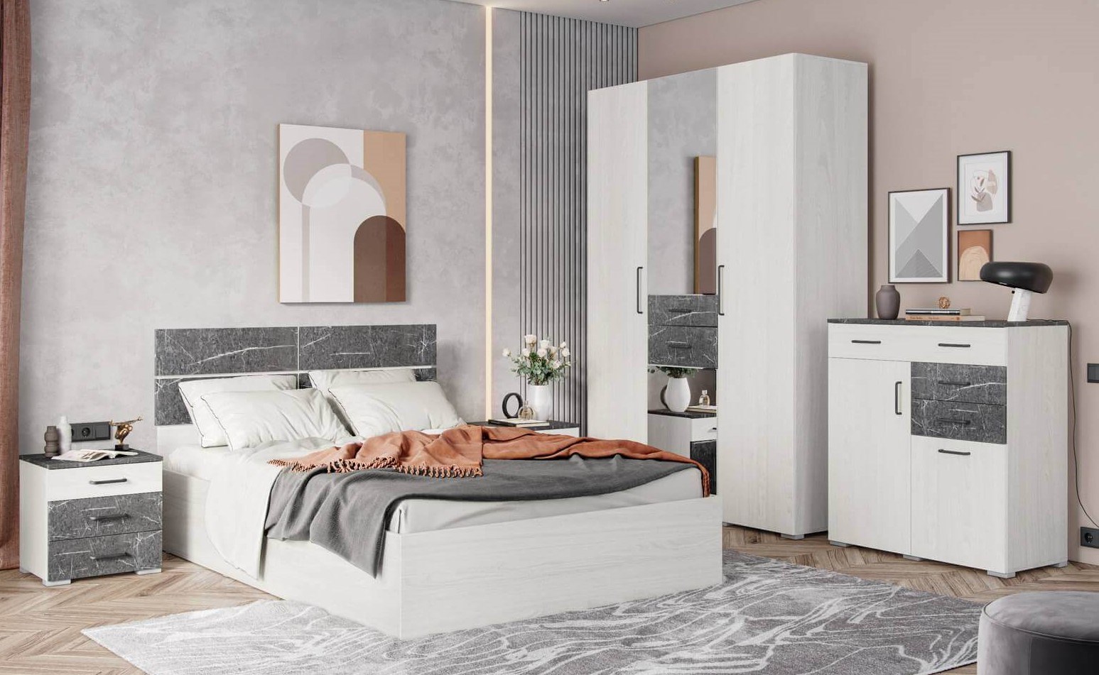 Современная стильная спальня. Качество отличное, оформили покупку доставили быстро. Менеджеру особая благодарность коротко ,грамотно помогла нам с выбором. Рекомендую спальню и интернет магазин.