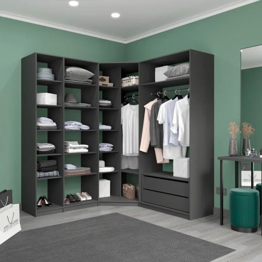 - Готовая гардеробная система обеспечивает комфортное хранение вещей в помещениях с небольшой площадью.
