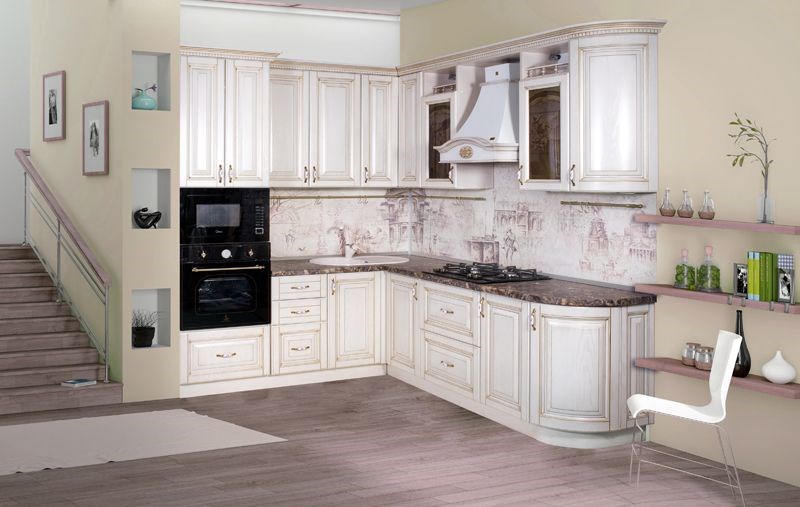 К качественным фасадам с фрезеровкой и патиной, защищенной матовым итальянским лаком мы добавили новые элегантные витражи и элементы ручной работы, что делает кухню еще более изысканной.