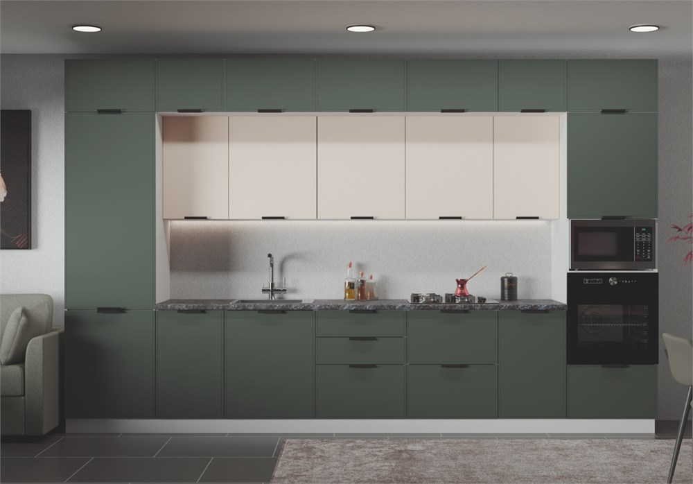 Палитра и дизайн позволяют легко сочетать кухню с другими моделями и оттенками, вписывая её в разные интерьеры. Тонкое фрезерованное обрамление фасадов создаёт линейную геометрию, популярную в моде. Рамка добавляет выразительности и лёгкости. Надёжные опоры нижних модулей облегчают уборку под шкафами.