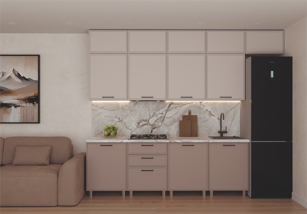 Палитра и дизайн позволяют легко сочетать кухню с другими моделями и оттенками, вписывая её в разные интерьеры. Тонкое фрезерованное обрамление фасадов создаёт линейную геометрию, популярную в моде. Рамка добавляет выразительности и лёгкости. Надёжные опоры нижних модулей облегчают уборку под шкафами.