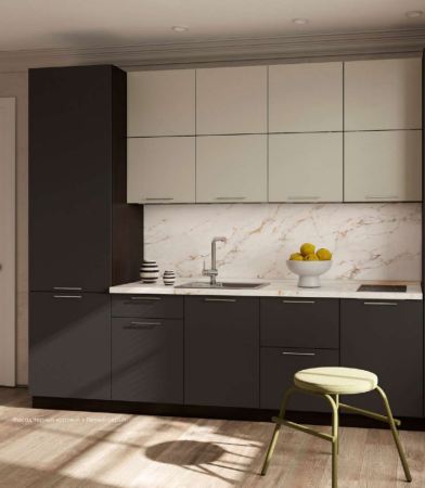 Фасад: Теплый серый - МДФ с покрытием Акрилит (использование плит турецкого производителя Kastamonu толщиной 18 мм, которые изначально покрыты пластиковым слоем. Высокая устойчивость к ультрафиолетовому излучению и температурным колебаниям, что обеспечивает долговечность и сохранение первоначального внешнего вида в условиях интенсивной эксплуатации).