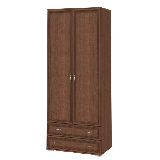 Шкаф с распашными глухими дверками и выдвижными ящиками оснащен стационарной металлической штангой для размещения одежды на плечиках. Рамочные фасады с эффектом благородной старины прекрасно гармонируют с общим видом спального гарнитура.