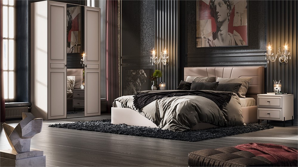 Декор. Важной особенностью коллекции «Пандора» является повторяющаяся геометрическая фрезеровка на фасадах, крышках тумб и комодов в стиле неоклассики, что придает мебели особый шарм и утонченность. Этот стиль сочетает в себе изящество классических форм и современных деталей, создавая ощущение легкости и элегантности. Фурнитура. Оригинальный узор ручки в сочетании с фрезерованными фасадами создает стильный вид и не перегружают образ. Высокие металлические опоры, окрашенные в матовый глубокий цвет «Черный муар», придают легкость внешнему виду и упрощают уборку, позволяя роботу-пылесосу свободно передвигаться под мебелью. В комплектацию шкафов входят две петли с функцией плавного закрытия ("доводчики") и две стандартные петли, что обеспечивает бесшумное и аккуратное закрывание дверей. Модульность. Коллекция «Пандора» включает в себя кровать, прикроватную тумбу, комод с выдвижными ящиками и вместительные шкафы: трехстворчатый шкаф с металлической штангой и полками, шкаф для одежды и шкаф для белья, которые позволят создать дополнительное и удобное место для хранения. Кровать. Изголовье кровати «Пандора» с декоративной строчкой в виде мягко преломленных лучей, позволит подчеркнуть уже имеющийся интерьер комнаты и привнести в него стильные ноты. Конструктив кровати без подъемного механизма. Каркас модели выполнен с эффектом «парения», что является сбалансированным вариантом, с помощью которого можно добиться стильного внешнего вида и функциональности. Высота от пола до царги кровати составляем 130 мм, что обеспечивает свободный доступ для робота-пылесоса, упрощая процесс уборки и поддержание чистоты в вашем доме. Основание «Комфорт 2.1». Разборный каркас основания без ПМ (без опор) изготовлен из плоскоклееных березовых брусков и 30-ти латофлексов, дополнительную фиксацию которым придают пластиковые латодержатели. Конструктив кровати с подъемным механизмом. Каркас модели надежно стоит на полу, опираясь на незаметные пластиковые подпятники, которые обеспечивают хорошую устойчивость и жесткость конструкции, а её функциональность увеличивается за счет возможности поднять основание и разместить все необходимые предметы в свободном пространстве. Основание ИП 462-02 исп .3 Разборный каркас основания с подъемным механизмом изготовлен из металла и 28-ми латофлексов, дополнительную фиксацию которым придают пластиковые латодержатели. В комплекте находятся газлифты с мощностью 1000 ньютонов. Заглушина тип 2, состоящая из двух деталей ДВП, может располагаться в любом из отсеков каркаса, так как не имеет дополнительных креплений. Это незаменимое дополнение, которое организует место для хранения и сохранит порядок в кровати. |